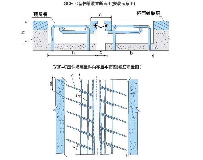 圖中:h、b分別為預(yù)留槽深度與寬度,a為錨固筋與邊梁之間的角度,用戶可根據(jù)橋梁實(shí)際預(yù)留槽尺寸 選擇GQF~C、GQF-F. GQF-E. GQF—Z. GQF~L中所列任一種,如用戶有特殊要求,可向我公司提 供具體圖紙,我公司將為您另行設(shè)計(jì)。