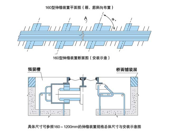 為適應(yīng)河流方向與行車(chē)路線不垂直的橋梁需要,可將錨固鋼筋和位移控制箱斜向布置,即將伸縮量為0~ 80mm的各種伸縮裝置及I60~1200mm的模數(shù)式伸縮裝置的錨固鋼筋及位移控制箱水平傾斜的焊在異型邊梁 上,其錨固鋼筋與邊梁的交角隨橋梁的傾斜方向與傾斜程度而改變。