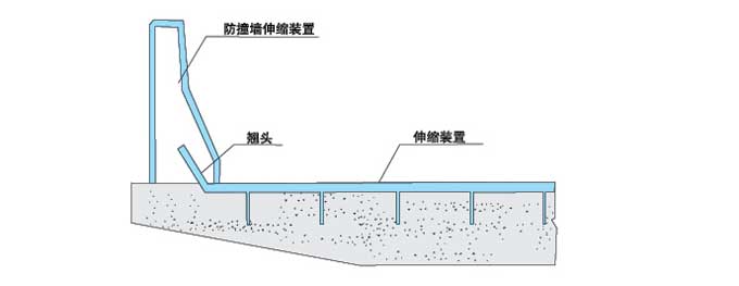 為了防止橡膠密封袋內(nèi)的積水流向墩臺(tái),可在伸縮裝置兩端設(shè)置翹頭,伸縮裝置的翹頭可根據(jù)不同的路面設(shè)計(jì)不同的樣式(翹起來(lái)長(zhǎng)度及角度),翹頭一般置于防撞墻內(nèi)部。如下圖所示: