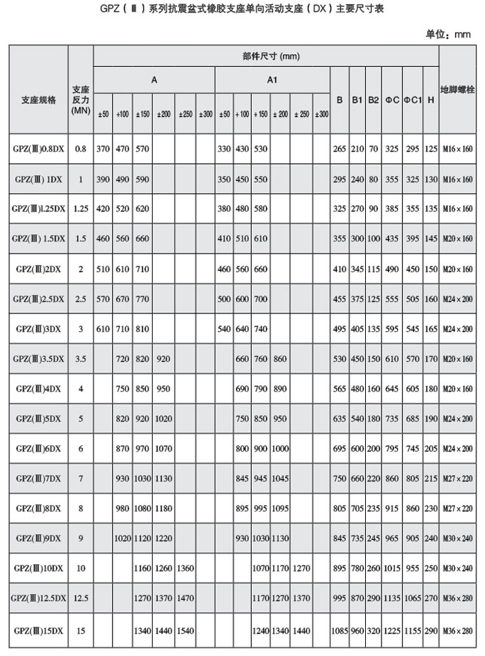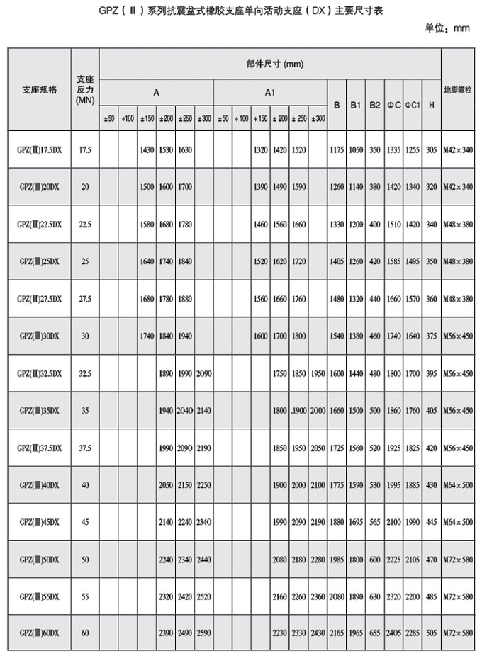 盆式橡膠支座按其使用時(shí)的位移能力分為二類,即單向活動支座具有豎向 轉(zhuǎn)角功能和單一方向位移功能,代號DX;