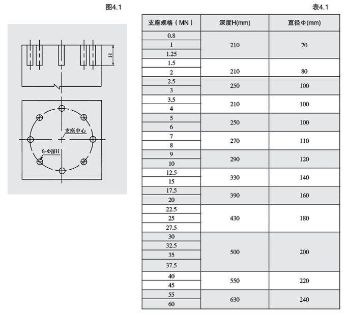 a.澆注壤臺墊石時(shí),在墊石頂面做出地腳蜾栓套筒預(yù)留孔。如圖4.1所示,預(yù)留孔深度及直徑見表4.1。
